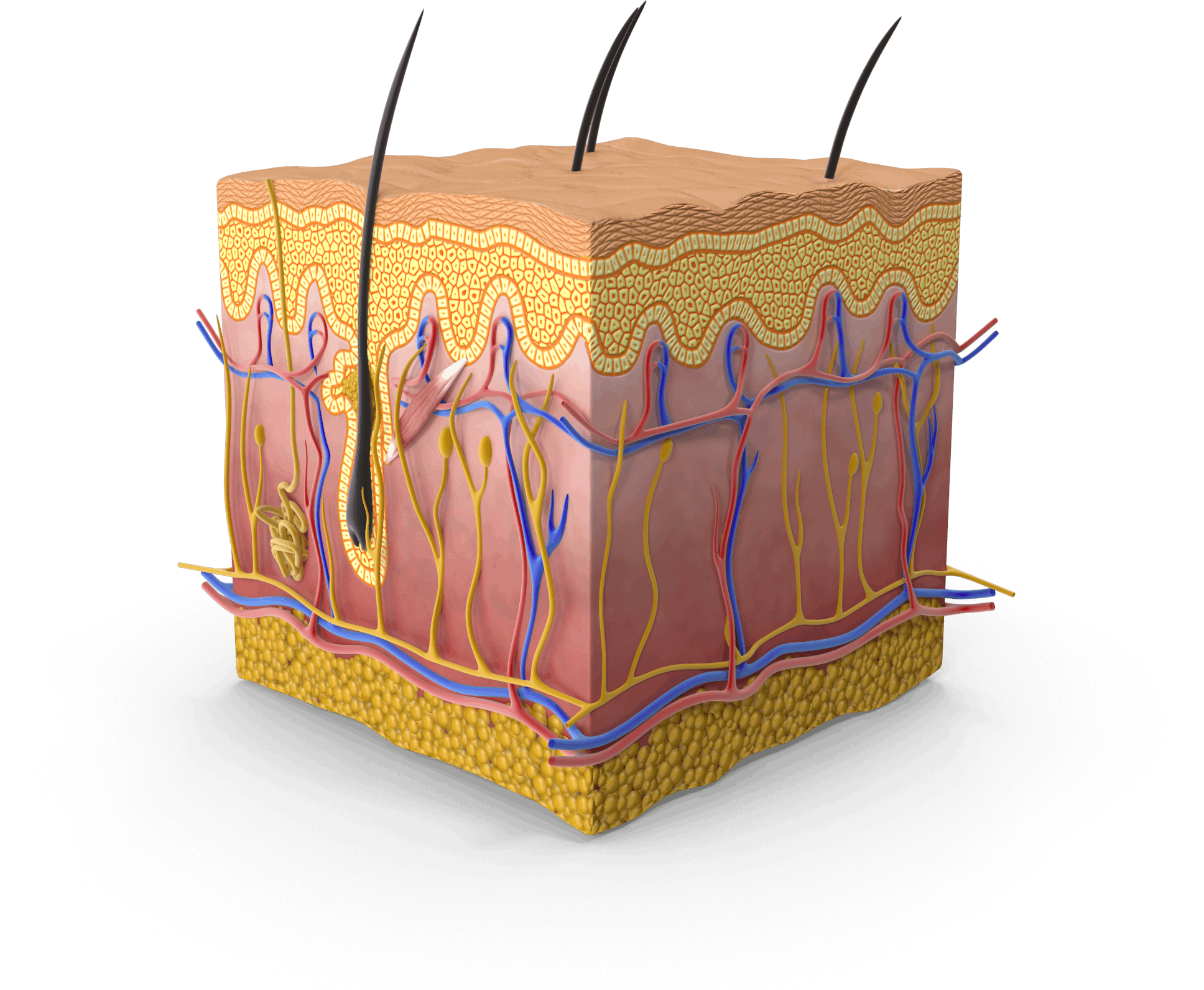 As moléculas de colágeno são compostas por três cadeias polipeptídicas em uma formação de tripla hélice, o que faz delas estruturas estáveis e resilientes que fornecem elasticidade e suporte a vários órgãos e tecidos.